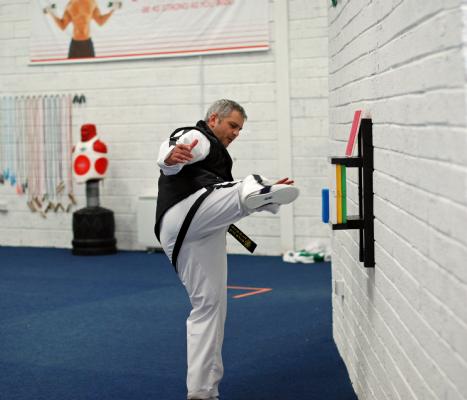 The main focus of the class was correct use of the body to increase power and also to ensure, through correct foot positioning, maximum power could be acheived whilst kicking. To prove this point, Master Nicholls demonstrated the perfect turning kick on 2 plastic boards (equal to 5.5 inches).