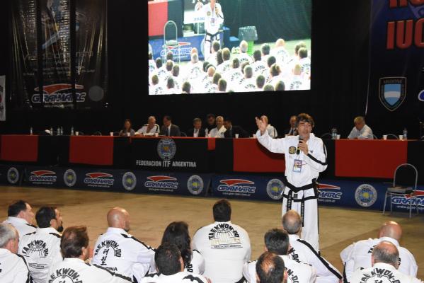 La presentación en Tecnópolis le dió al evento un marco muy especial, el estadio del Bicentenario lo particularizó y la escenografía lo puso en un lugar sin precedentes para un evento de estas características. Las palabras de bienvenida estuvieron a cargo del presidente de la Federación Argentina el M. Ebel Barat. Los bloques se fueron sucediendo de manera ordenada y prolija, las diferentes instancias del seminario de arbitraje a cargo del GM. N. Galarraga y el M J. Maidana dieron lugar a los temas técnicos que fueron abordados con mucha profundidad. En dicho segmento participaron de la disertación los M. Alberto Maidana, M. Quintana y Héctor Avendaño. Los temas históricos a cargo del GM. Mario Troiano abrieron la puerta para que el GM. Jon Chan Kim desarrollara particularidades de la historia que solo él puede narrar con la autoridad que le da ser el pionero más destacado en la formación civil del TKD y la ITF, acompañado por el GM, Han Chang Kim introductor del TKD en la República Argentina, quienes junto al GM Choi, Jung Hwa, hijo del fundador del Taekwon-Do generaron un momento místico único e irrepetible.