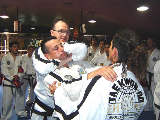 Master Nestor Galarraga, Chairman of the ITF Umpire Committee, invited Don Dalton to Buenos Aires to conduct a special workshop at the Monte Grande dojang which is the centre of the Taekwon-Do Association of Argentina (TAA). Mr. Dalton is the coach for ITF Team Europe and was the head coach for the Irish men’s senior team and the Irish female senior team for the ITF World Championships. Both teams won the team sparring in Birmingham. The session was attended by around 40 members, the majority of which were black belts. This included many international instructors (Germán Sánchez, Romina Galarraga, Juan Ancona, Montiel, Sergio Oyarzo, Silvia Farigu y Salvador Testa) and also many ITF world champions. The workshop had a relaxed and fun atmosphere throughout and the participants were encouraged to contribute with questions and comments. Time was spent explaining the fundamental differences between the average Northern European style of sparring and the Latin American counterpart. It was noted how many European coaches have adapted their instruction to include both systems of matsogi. The workshop concluded with some realistic self defence and some exercises to develop the “pump side kick.”