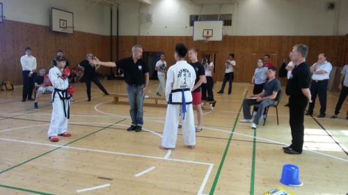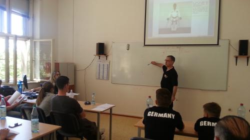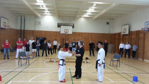 Large numbers of foreign students and honored guests arrived to Znojmo from different parts of the whole world already in Thursday. The three day marathon started on Friday 5th June with Umpire course dedicated to international I.T.F. umpires. The umpire course was held in University of Economics in Znojmo. Both theoretical and practical education was led by international instructor Gérard Galinski IV.Dan from Germany and after lunch the course joined also European Chief Umpire Master Fernando Peréz VII.Dan from Spain. Representatives from following countries took part of the course: Czech republic, Georgia, Ireland, Moldovia, Germany, Slovenia, Spain, Switzerland. Four graduates from Czech TKD I.T.F. So-San Znojmo have been successful: František Macek IV.Dan (Group A centre umpire), Bc. Radek Loucký III.Dan, Antonín Belháč III.Dan and Jakub Kmec I.Dan (all Group B – corner umpire)