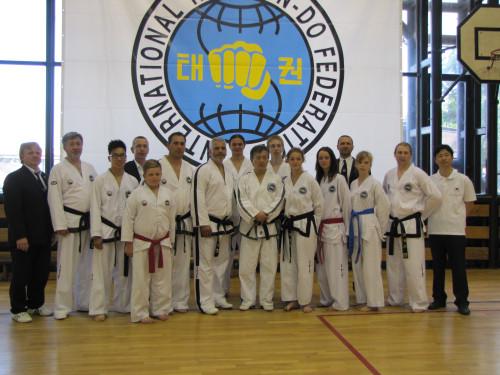 On Sunday 7th June, the three day marathon continued by International Master Class led by Grand Master Choi Jung Hwa IX.Dan. Together with Grand Master Trevor Nicholls, Secretary General of I.T.F. they explained and teach basic techniques, but also patterns. Techniques were exercised on pads and in small groups. In the Master Class, students, Instructors and Masters from Czech republic, Canada, Ireland, Germany, Slovenia, Spain, Switzerland Ukraine and UK, took part.