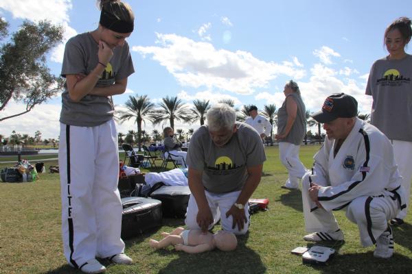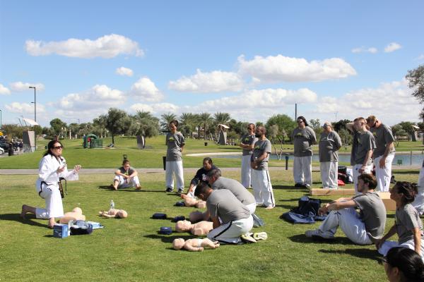 Sunday took place exclusively in the park. It consisted of Grand Master Nicholls finishing the Master Class portion of the retreat with an emphasis on patterns. He was then followed by Mrs. Deann Gould-Lancaster who did the physical test of participants on Cardiopulmonary Resuscitation (CPR). Her portion of the retreat included online training which was completed by participants prior to the retreat and then the physical test out where students had to demonstrate proficiency in their skills.