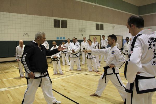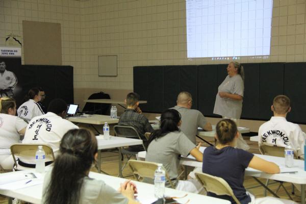 Events started Friday evening with dinner for those who arrived early enough. Saturday was filled with the first half of a Master Class led by Grand Master Trevor Nicholls. He reviewd the basics of front snap kick, crescent kick, hooking kick, and verticle kick. There was strong emphasis on knee position, creating a "C" shape with the body while kicking, and connecting all portions of the movement to ensure a powerful, smooth, effective delivery. Following Grand Master Nicholls there was a short lunch break. After lunch Mrs. Vickie Harbison provided an excellent presentation on working with special needs students. She included pictures, and videos of working with her special needs students. Then Mrs. Diana Hansen (a licensed medical message therapisst) presented on different modalities available to help move past injuries and how to prevent future injuries. Amazingly she had no difficulty getting volunteers for her portion of the retreat. There was a dinner and meeting at the park in the evening.